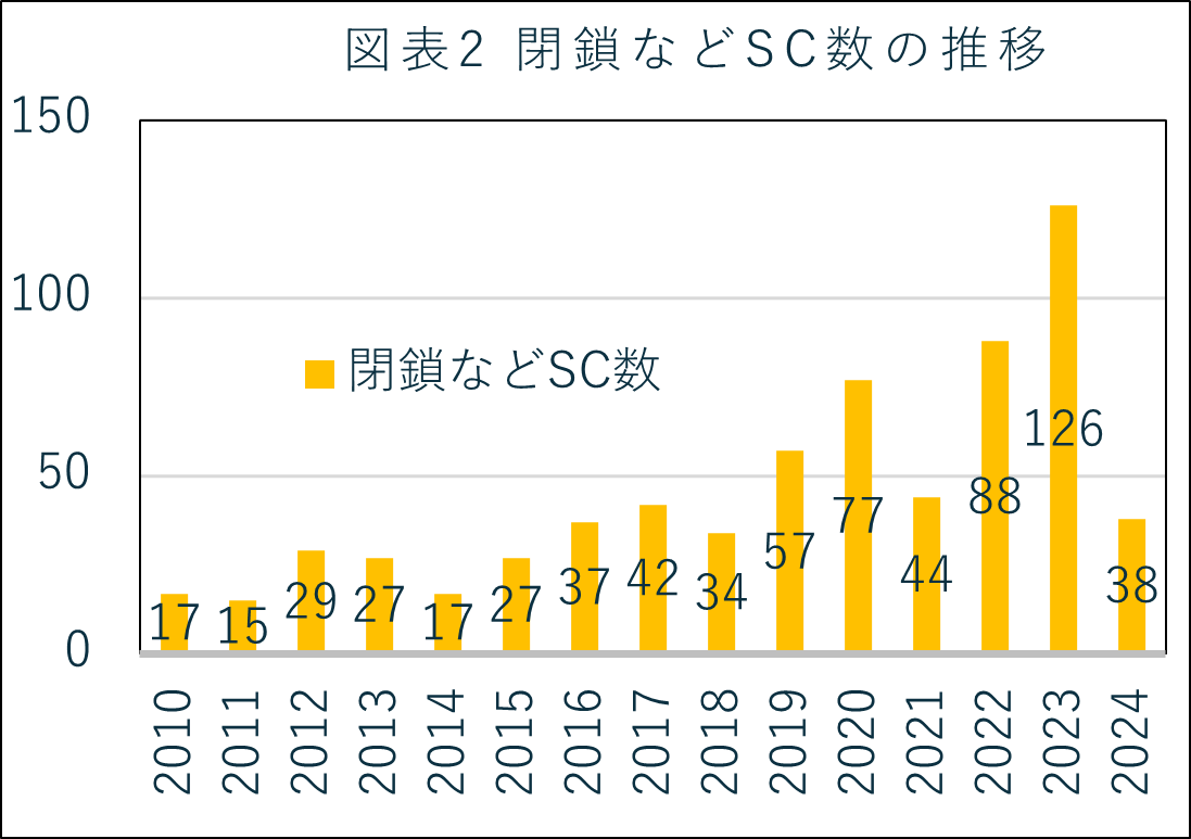 一方、閉鎖などをしたSCは、38カ所となった(図表2)。この数値は閉鎖・閉店になったものに加え、上記の定義や取り扱い基準から外れる施設も含むため「など」と表現されている。