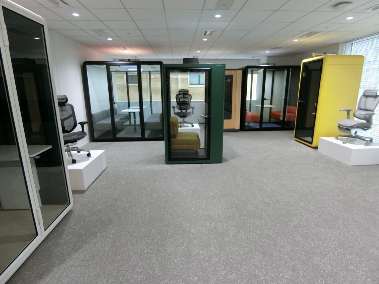 約80坪のスペースに、世界51カ国で販売される高機能チェア「エルゴヒューマン」、個室型ワークブース「コロ」、国産ヒノキを使用した木製ブース「フォーカス」の3ブランドに絞って展示している。