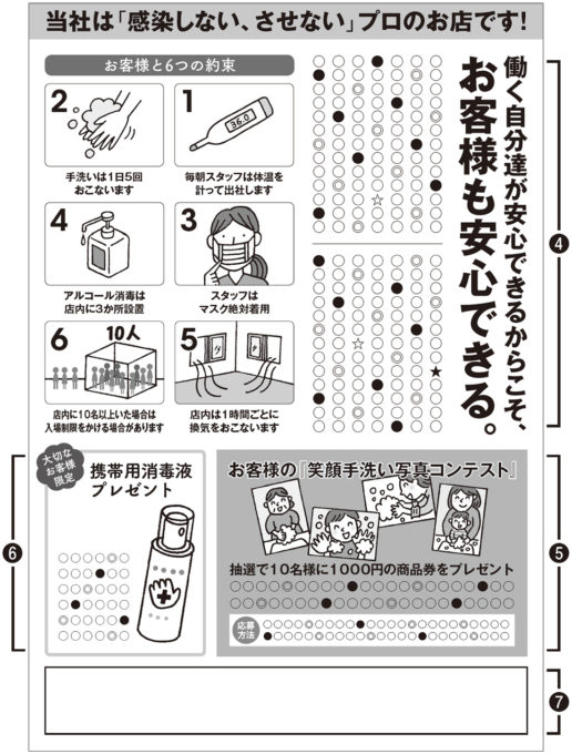 ⑦手書きのコメントが書けるスペースを用意するといい。自分たちががんばっている旨が伝わる直筆メッセージを書き添えれば、お客様も応援したい気持ちがよりいっそう高まる。