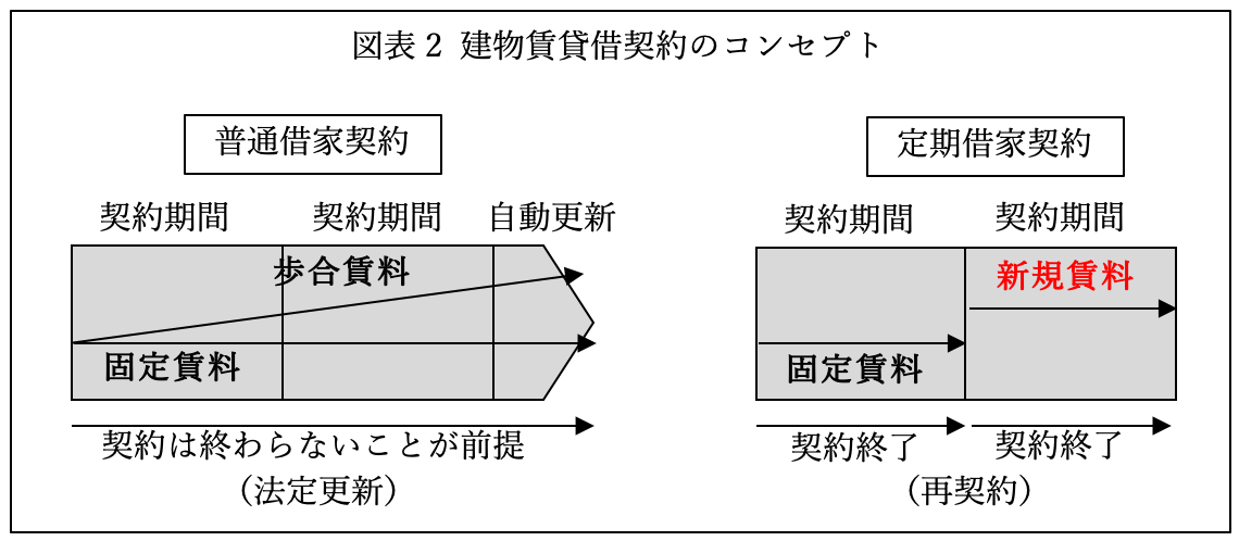 定期借家制度は、契約自由の原則という近代社会の概念に近づき、再契約のたびに新規賃料を決めるタイミングを作り出したのである。