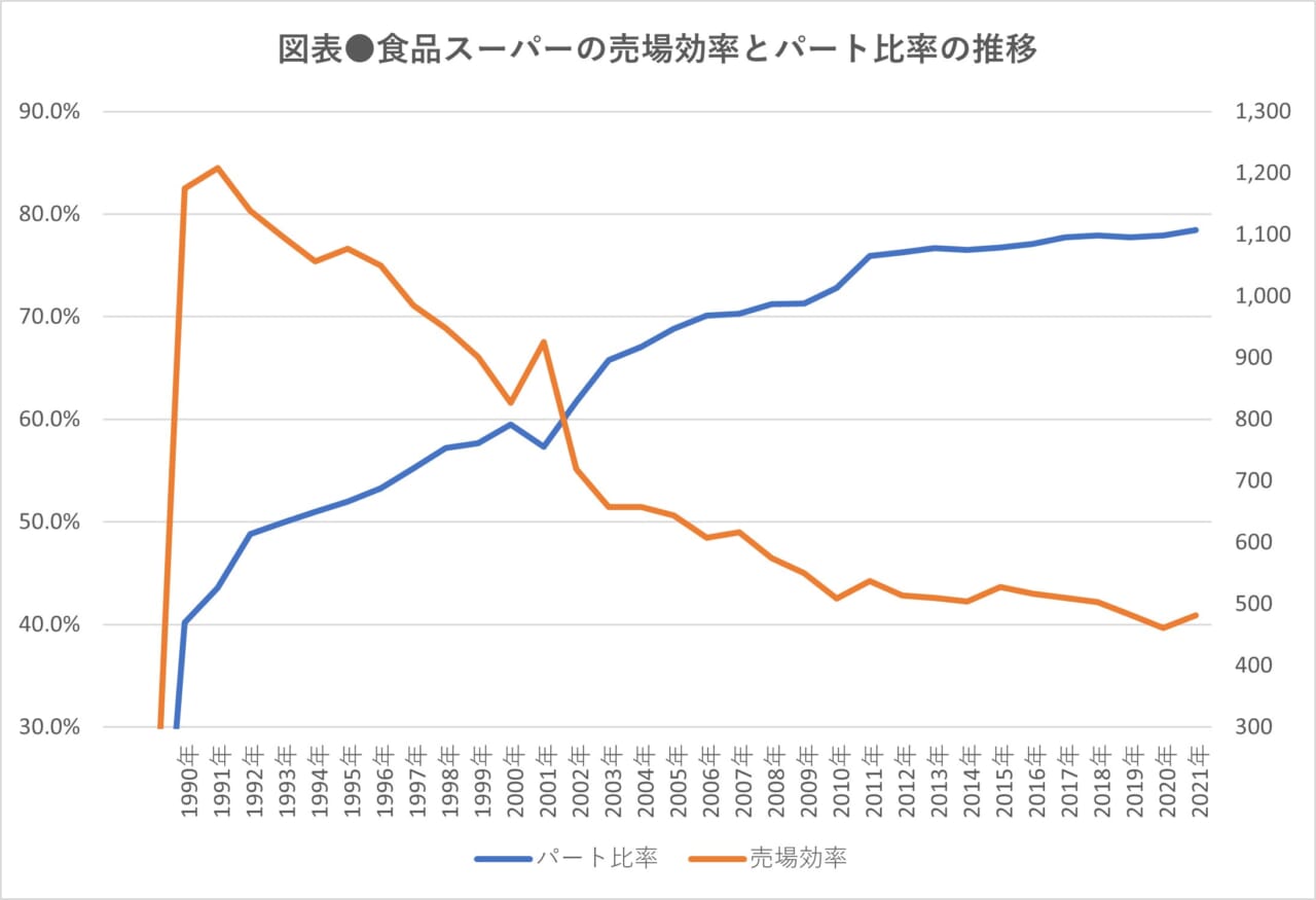 次の図表は食品スーパー(総合スーパー含む)の1990年以降の長期的な売場効率(売場面積1㎡当たりの売上高)と従業員のパート比率の長期時系列推移を示したものだ。このデータが示すことをざっくり表現すれば、90年代以降、消費の停滞と競争の激化が進んだ食品スーパー業界は、売場面積当たりの売上高が下降する傾向が続いたため、収益性の低下が続いていた。