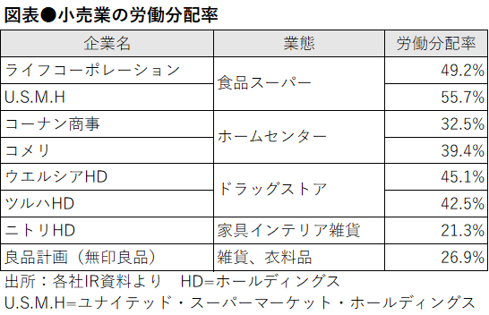 下の図表は食品スーパー、ホームセンター、ドラッグストアの上場大手の「労働分配率」を示したものだ。労働分配率とは、「商品売上から原価を引いた粗利益高のうち、そのくらいを人件費に使わねばならないか」という指標で、そのビジネスモデルがいかに従業員の労働力に依存しているかを表す。