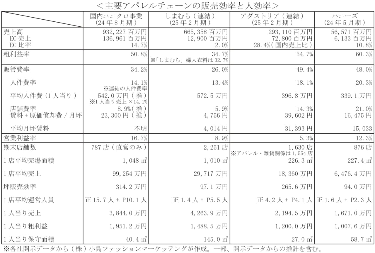 それを可能としているのが店舗規模の大きさで、国内ユニクロは平均1048㎡/9億9254万円、しまむらは1010㎡/2億9717万円に達するのに対し、アダストリアは226.3㎡/1億8360万円、ハニーズは227.4㎡/6476万円にとどまる。1㎡あたりの販売効率は国内ユニクロが最も高く95.2万円、次いでアダストリアが80.5万円、しまむらが29.4万円、ハニーズが28.5万円と格差が大きいが、店舗規模と運営システムの違いで1人当たり保守面積がしまむらの145.0㎡、ハニーズの58.7㎡、国内ユニクロの40.4㎡、アダストリアの27.0㎡と大きく異なり、前述した1人当たり売上高の格差につながる。