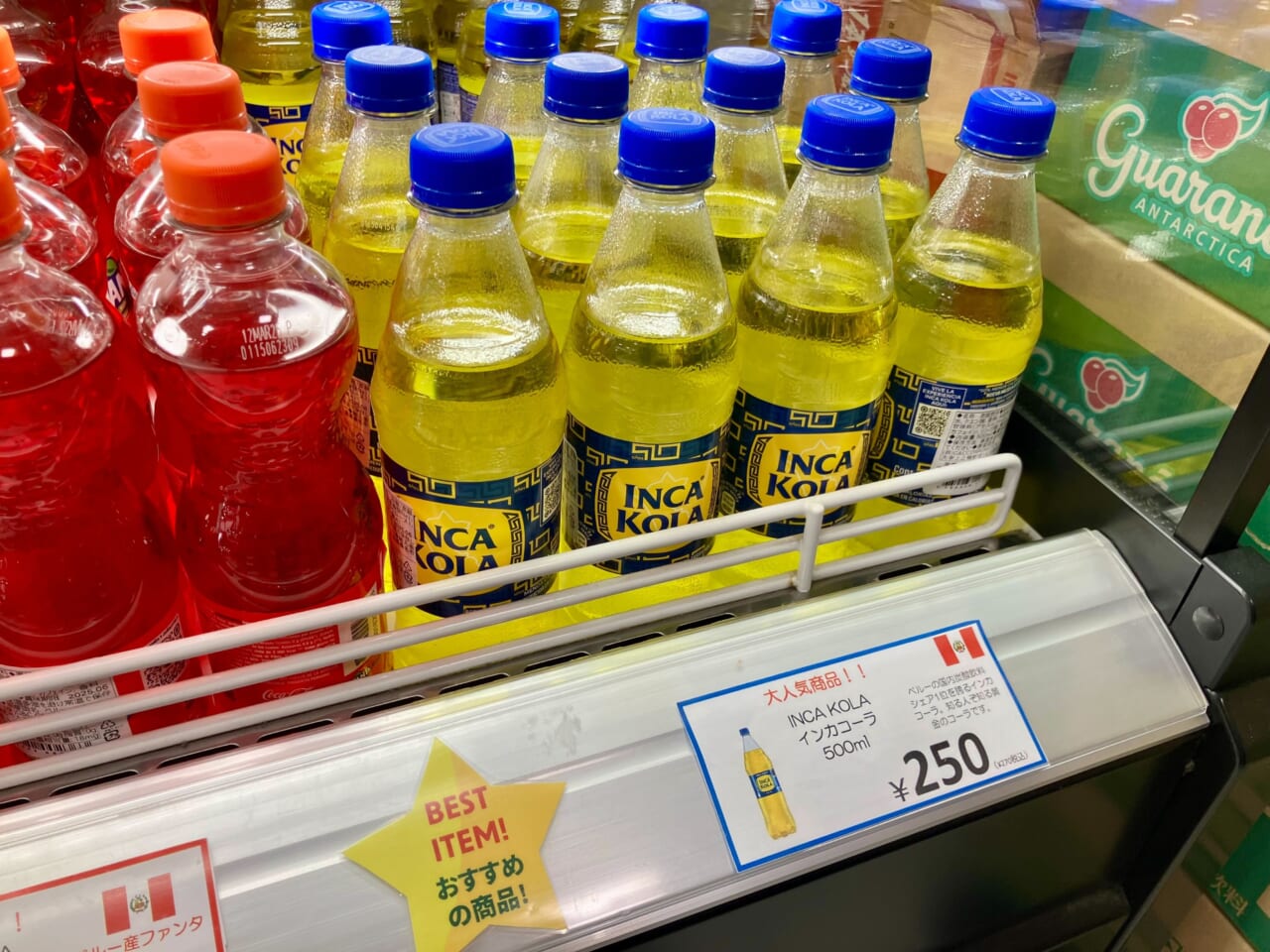 飲料棚では、日本国内で販売されている商品のほかに、ペルー発祥の黄色い炭酸飲料「インカコーラ」やペルーで製造された「ファンタ」などの輸入飲料も扱う。