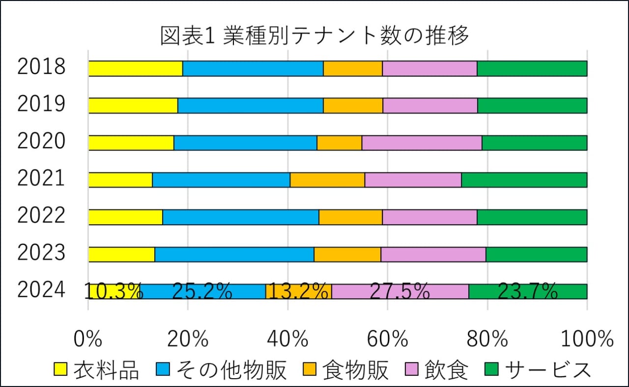 24年開業のSCに出店した店舗数割合を見ると、飲食が27.5%となり、衣料品の10.3%を遙かにしのぐ(図表1)。この数字は面積ではなく店舗数なので肌感覚とは異なるが、経年で見ると明らかに増加している。コロナ禍の影響を最も受けた飲食店だが、高齢化も手伝い飲食業の勢いは増している。考えてみれば、「食べる」「飲む」は、インターネットには代替できないコト消費の代表格だろう。