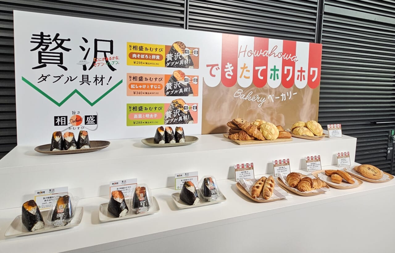 発表会で展示された新商品「旨さ相盛おむすび」と「セブンカフェ ベーカリー」のパン
