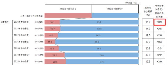 参加予定率が最も高かったのは男女とも20代だった。20代男性は25.3%、20代女性は21.4%が参加予定と回答している。前年の参加実績と比べると、30代女性(2.4ポイント増)や50代男性(1.6ポイント増)の参加予定率が増加した。一方、30代男性(1.2ポイント減)と40代女性(0.6ポイント減)の参加予定率は減少した。