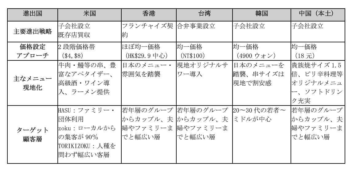 香港には2412月に進出し1店舗を構える。現地の食品製造・販売大手「四洲集団」とフランチャイズ契約を締結して参入した。その結果、開店初日には鳥貴族全店舗の中で過去最高の売上を記録し、その後も高水準の業績を維持しているという。