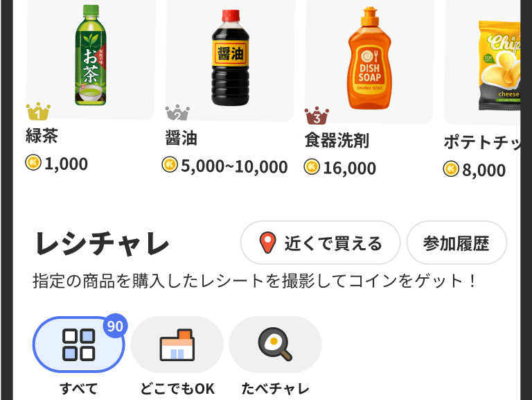 ユーザーがポイントを獲得する方法はさまざまだ。メーンとなるのが、対象となる食品スーパーやドラッグストアなどで指定の商品を購入し、そのレシートを撮影・投稿すると、アプリ上でポイントがもらえる「レシチャレ」。日々のアプリログインや、1日の歩数に対してもポイントが付与される。ユーザーはためたポイントを利用することで、各種共通ポイントやギフト券、商品引換券などの特典と交換できる。