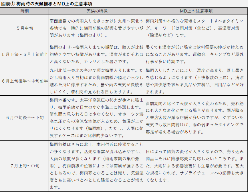 北海道を除き、例年5月頃から7月頃にかけての平均40日間程度、曇や雨の天気の日が多くなる梅雨。今回はその梅雨の期間を対象としたウェザーMDのポイントをまとめます。気温が平年より高い(あるいは低い)状態が続く場合の発注仕入れに役立つ内容もあるので、是非参考になさってください。