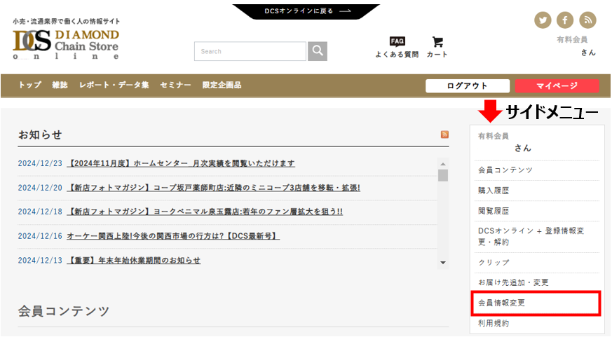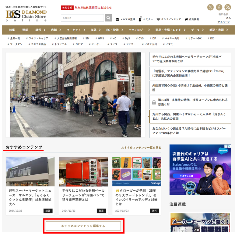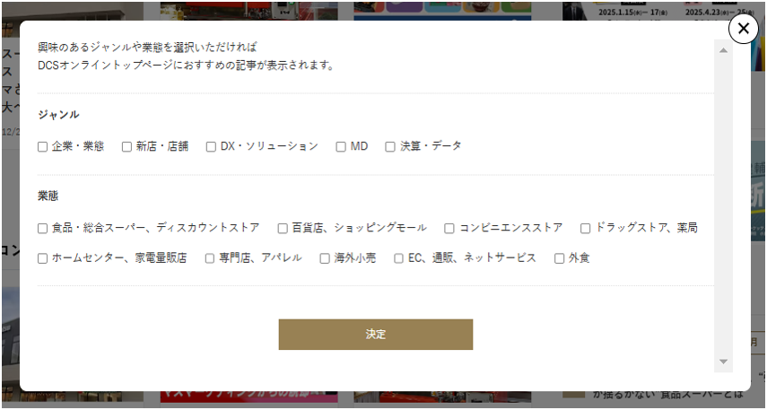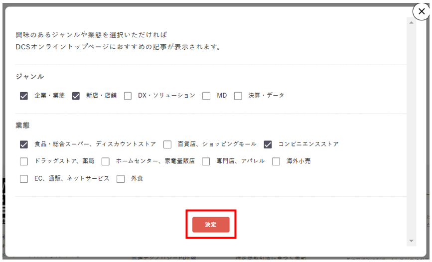 あらかじめ、興味のあるジャンル、業態を登録しておくことで、「おすすめコンテンツ」としてDCSオンライントップページに、該当する記事を優先的に表示させることが出来ます。