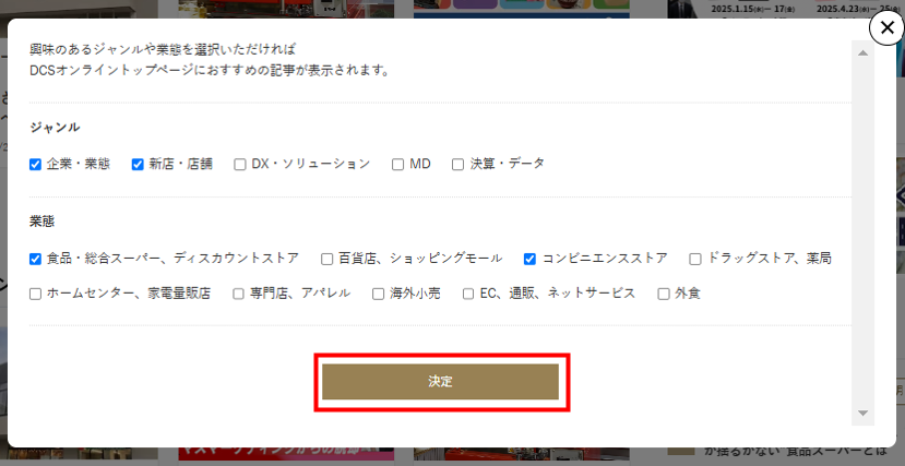 ④興味のあるジャンル、業態にチェックを入れ、「決定ボタン」をクリック
