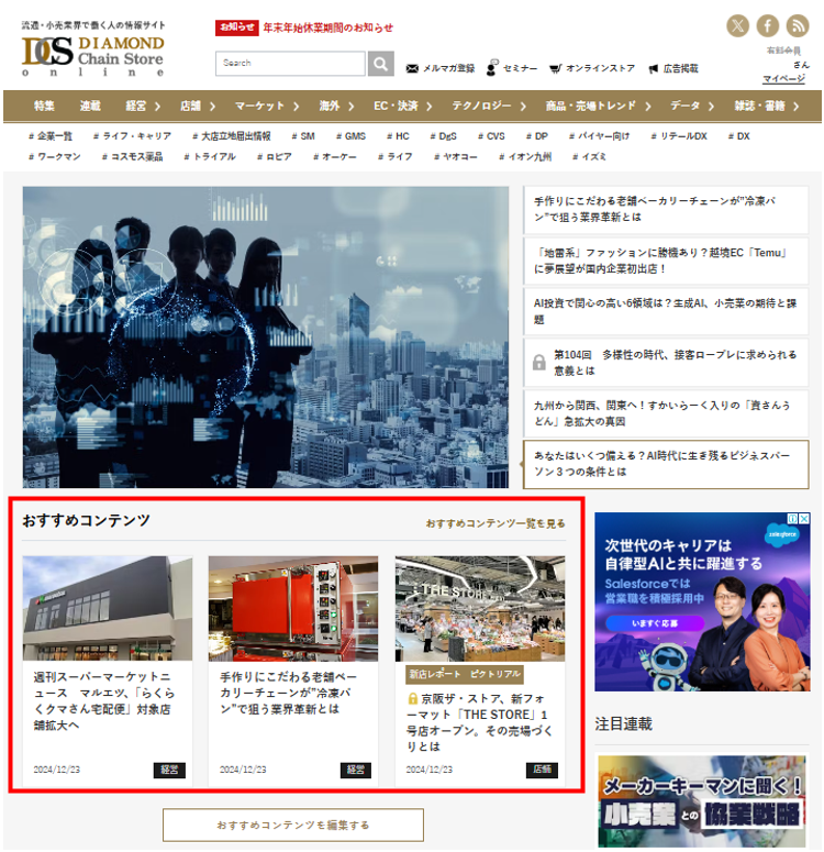⑥おすすめコンテンツ内に選んだジャンル、業態に関連するWeb記事が表示される