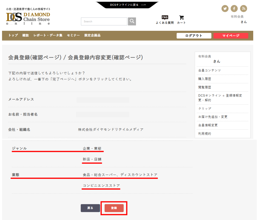 ⑥会員登録(確認ページ) / 会員登録内容変更(確認ページ)に遷移するので、登録内容に間違いがないか確認後、「登録ボタン」をクリック