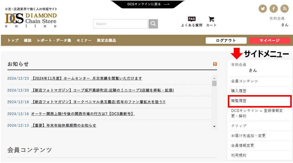 ②サイドメニュー内の「閲覧履歴」をクリック