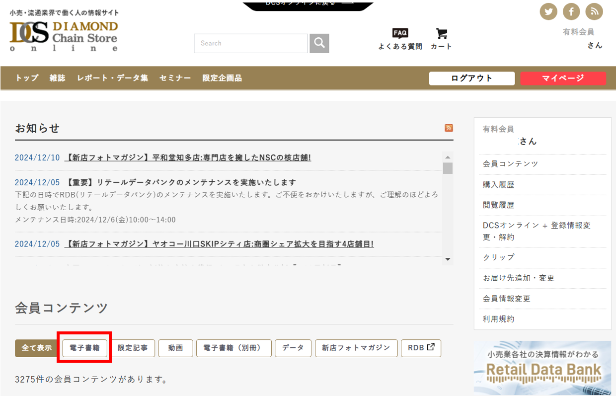 ②「会員コンテンツ」の中の「電子書籍タブ」をクリック