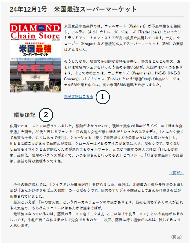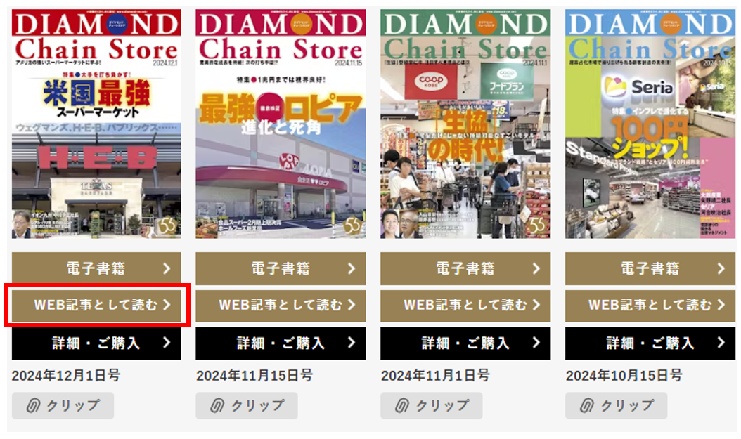 ダイヤモンド・チェーンストア誌の内容をWeb記事でお読みいただけます。発行号ごとにまとめたページを用意しております。電子書籍が読みづらいスマートフォンで雑誌の内容を確認したい時に最適です。