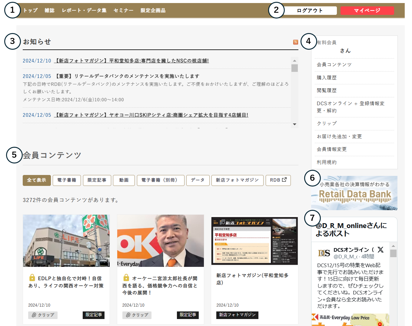 マイページの各項目をご紹介します。会員様へのお知らせ、会員情報の確認・変更、会員コンテンツの閲覧が可能です。