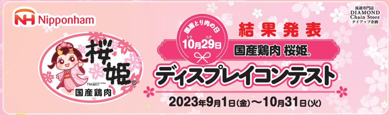 日頃よりニッポンハム商品に格別のおうlき立てを賜り、厚く御礼申し上げます。この度は、弊社の「国産鶏肉桜姫Rディスプレイコンテスト」にご参加をいただき、誡にありがとうございます。厳正な審査の結果、各賞が決定いたしましたので、ここに発表いたします。今後とも、弊社商品に、より一層のお引き立てを賜りますようお願い申し上げます。
