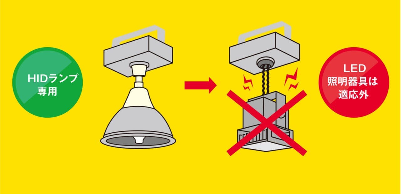 オートリフターは、照明器具の使用期間(10年目安)中にランプ交換などが必要になるHIDランプの保守メンテナンス用途に設計されたもの。LED照明器具との組み合わせでの安全性は確認されていない。