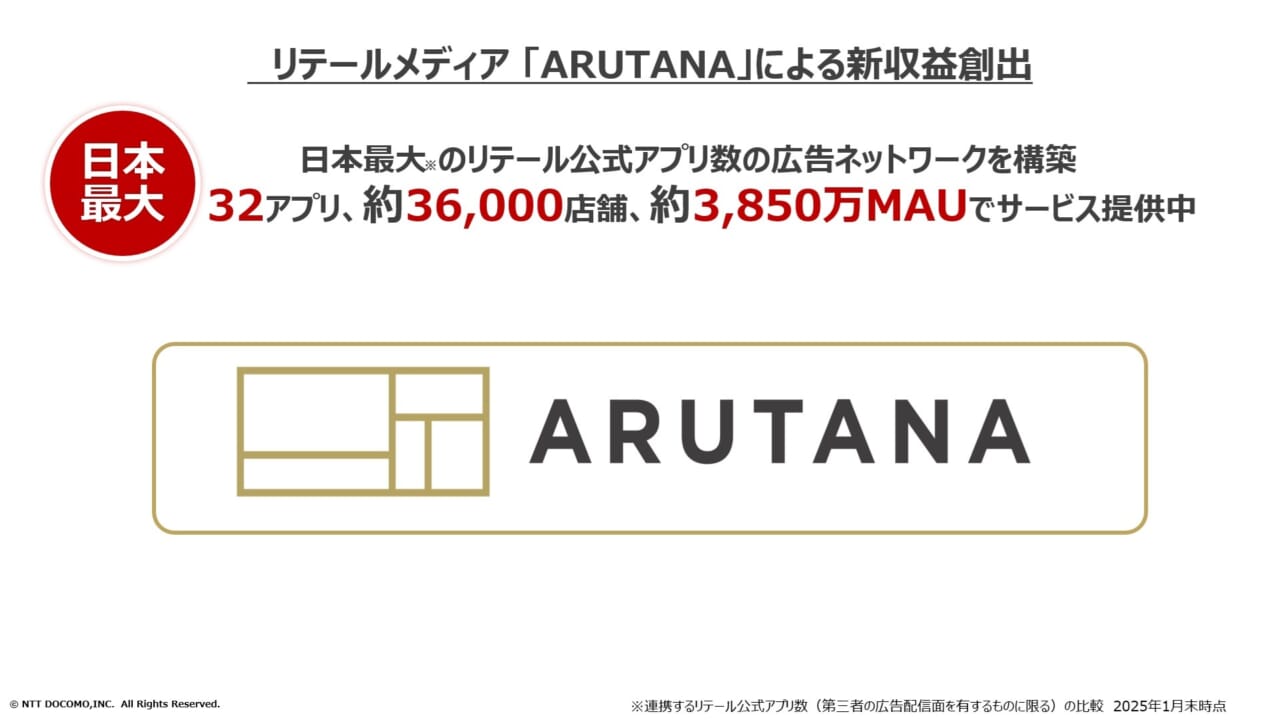 流通小売企業向けのマーケティングの中で近年特に注目度が高いリテールメディア。ドコモのグループ企業であるDearOneは流通小売企業の公式アプリに対し一斉に広告配信ができる国内初のアドプラットフォーム「ARUTANA(アルタナ)」を展開している。2業態の公式アプリ、約36000店舗、月間アクティブユーザー数約3850万にサービスを提供する。(2025年1月現在)