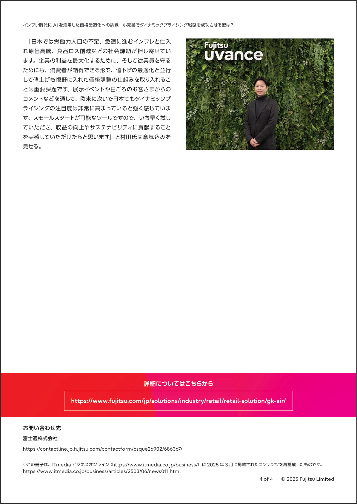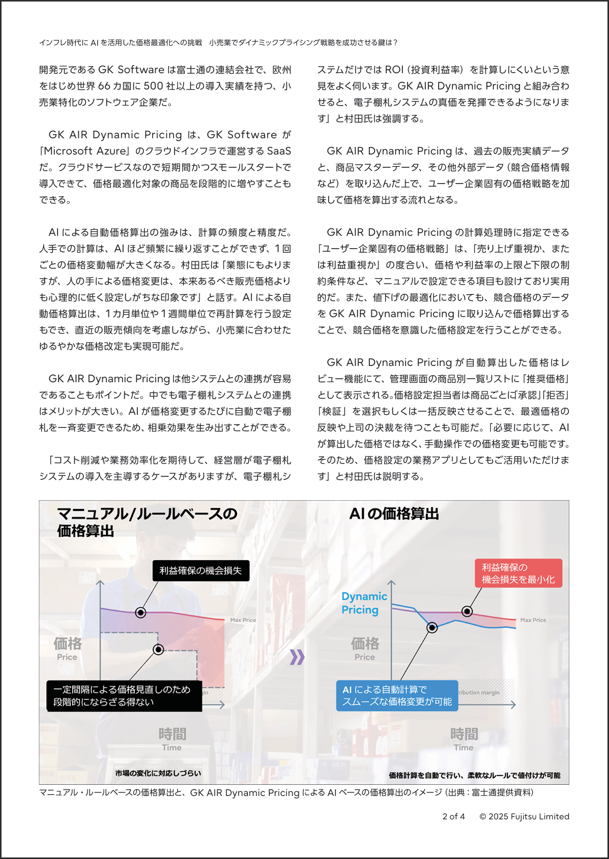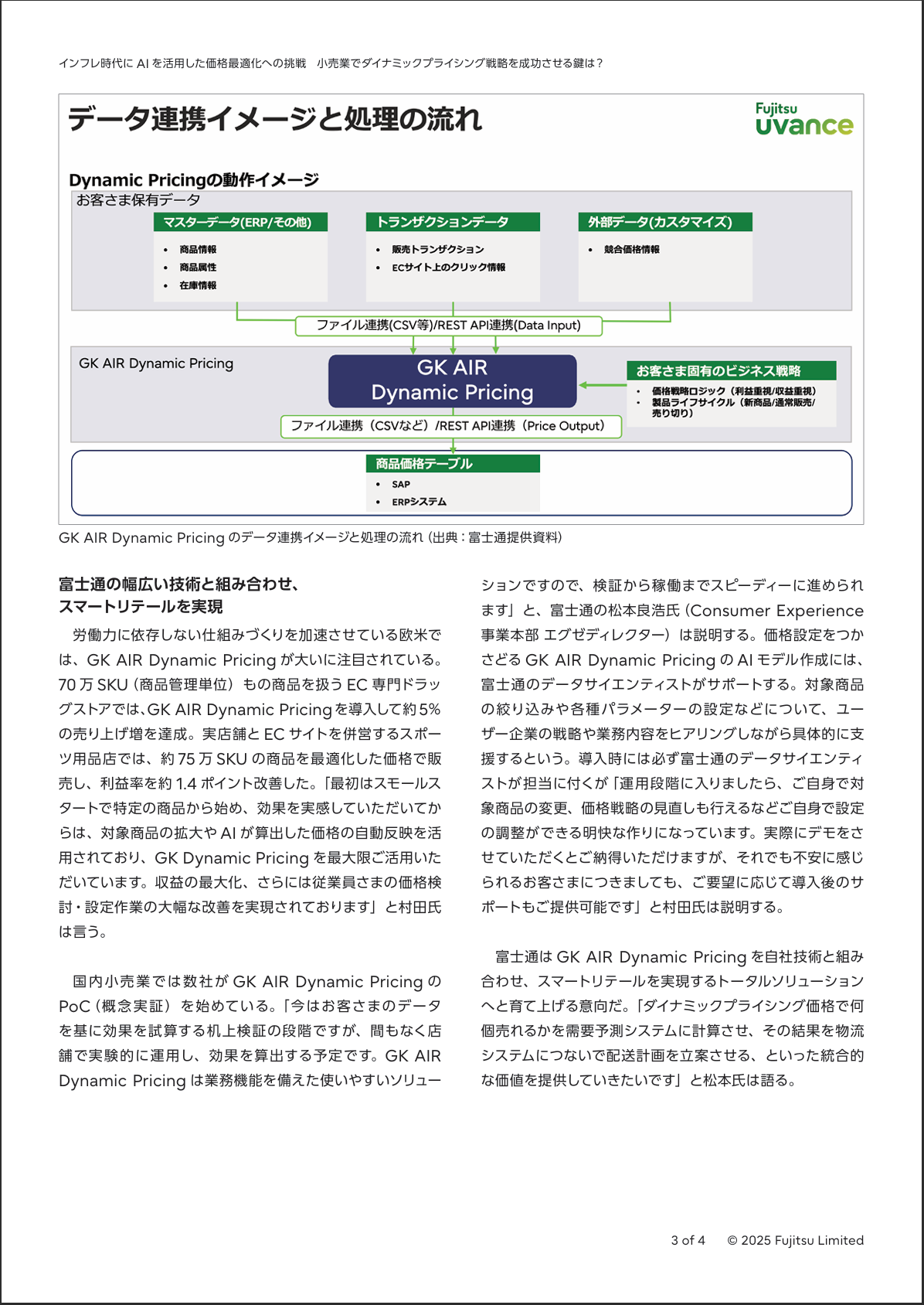 富士通の『GK AIR Dynamic Pricing』は、販売実績、競合価格、売上傾向などのデータをもとに、AIが最適な価格を自動で算出するクラウド型ダイナミックプライシングソリューションだ。