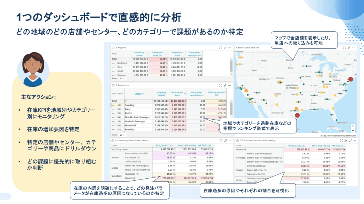 その上で、需要予測に基づいたシミュレーションと連動し、SKUごとの欠品・過剰リスクをアラートで検知、迅速な対応を可能にする。