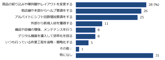「繁忙期の店舗を円滑に運営するためにどのような対策をとるか」(複数回答) には、「特になし」という回答が最も多く31%だった。