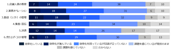 「現場業務の効率化に対して、課題を感じ対策を行っているか」について、下記の6項目で質問した。
