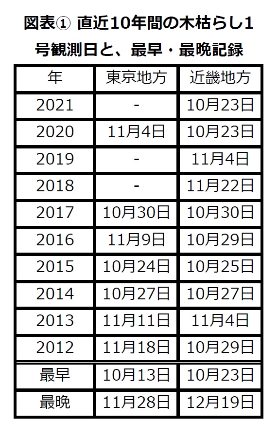 年によって木枯らし1号観測日にばらつきが大きく、特に東京地方では2018年以降の4年間で木枯らし1号が観測されたのは1回だけです。ここ最近10年の傾向を見てみると10月中に木枯らし1号が吹くケースが多いことが分かります