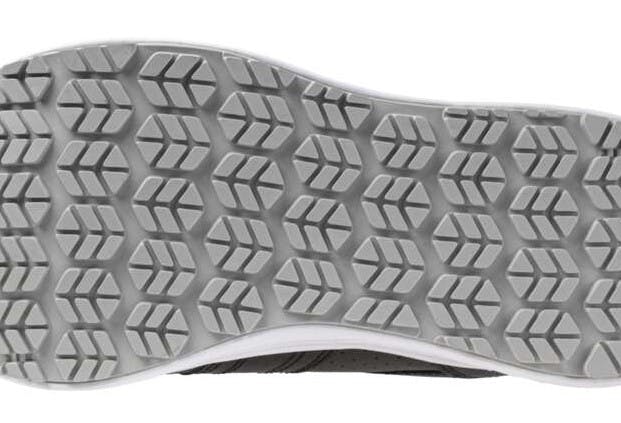 このモデルは食品スーパーのサミット(東京都/服部哲也社長)と共同企画し、食品小売業で想定されるあらゆるリスクに対応した仕様となっている。アウトソールの溝には油や水で滑りやすい床面での転倒リスクを最小限に抑えるべく、液体がたまりにくい意匠を施した。接地面には鏡面仕上げを施し、床との接地面積を増やすことで高い耐滑性を確保。さらに、靴底をつま先が上がるようなソール形状にすることで、つまずき防止にも配慮している。第三次産業における労災の約4分の1を占めるとされる転倒事故への対策として開発された商品である。