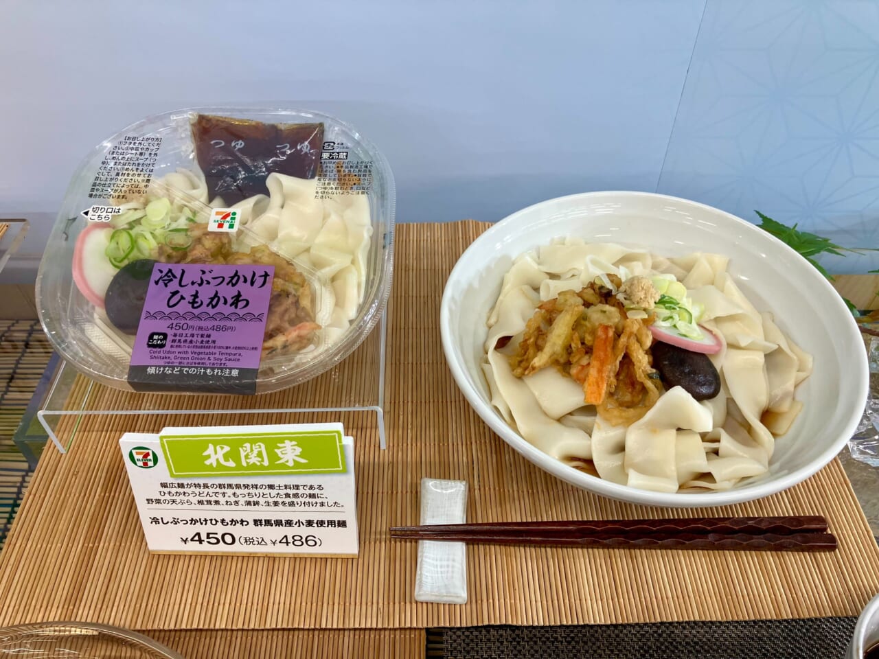 北関東では、群馬県発祥の郷土料理「ひもかわうどん」を再現した「冷やしぶっかけひもかわ群馬県産小麦使用麺」(486円 以下、税込)を販売する。群馬県産小麦3種を配合し、もちもちとした食感に仕上げた。具材には天ぷら、椎茸煮、かまぼこ、薬味などを添えている。