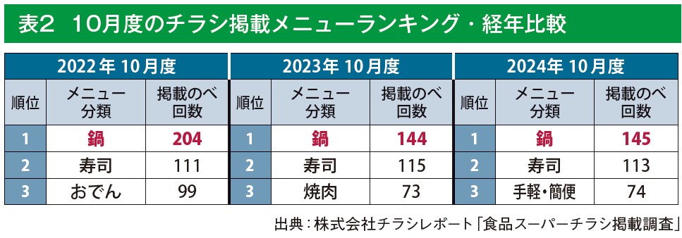 表2 10月度のチラシ掲載メニューランキング・経年比較