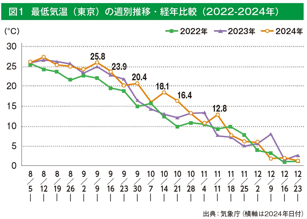 図1 最低気温(東京)の週別推移・経年比較(2022-2024年)