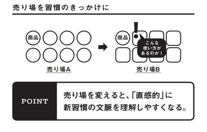 これと同様にカップスープをオフィスで飲んでもらう習慣を広げたいとき、コンビニに卸すのではなく直接オフィスで売ってしまうという 方法も考えられます。他にも、少し視点を変えて、老眼用のルーペをか ける習慣をもっと広げたいとき、メガネ屋ではなく本屋で売ってしまう方法だって考えられるでしょう。このように売り場を変えることで、直感的に生活者にこちらの意図を理解してもらうことができるだけでなく、いつもと違う場所で売られている意外性によって習慣を周囲に広めたくなるきっかけにすることもできるのです。