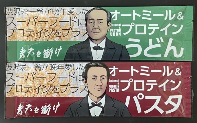 渋沢栄一にちなんだ新商品は、 「オートミール&プロテインパスタ」と「オートミール&プロテインうどん」(いずれも1袋100g/本体価格400円)の2商品。「渋沢栄一翁が晩年愛したスーパーフードにプロテインをプラス」したことが特徴の商品だ。パスタのパッケージオモテ面にはデフォルメした40代の渋沢栄一の似顔絵を、うどんのパッケージには60代のものを使用。前述の文言も大きく掲載し、渋沢栄一を深く印象付けるパッケージになっている。いずれの商品にも使用されているオートミールは、ビタミン・ミネラル・食物繊維が豊富な食材で、さらに、そこにタンパク質(プロテイン)を加えた。