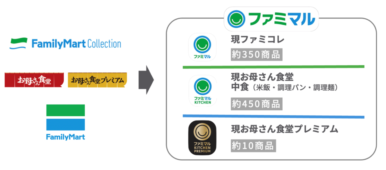 ファミリーマートの既存PBは、日用品、菓子、加工食品などの「ファミリーマートコレクション」、総菜や日配品、冷凍食品などの「お母さん食堂」と、高付加価値帯の「お母さん食堂プレミアム」の3ブランド。「ファミマル」移行後は、「ファミリーマートコレクション」を「ファミマル」、「お母さん食堂」と従来ファミリーマートロゴだけが記載されていた弁当・サンドイッチ、レンジアップ麺類などを「ファミマルKITCHEN」、「お母さん食堂プレミアム」を「ファミマルKITCHEN PREMIUM」として整理・統合する。内訳は「ファミマル」約350種類、「ファミマルKITCHEN」約450種類、「ファミマル KITCHEN PREMIUM」約10種類の合計約810種類の展開を見込む。