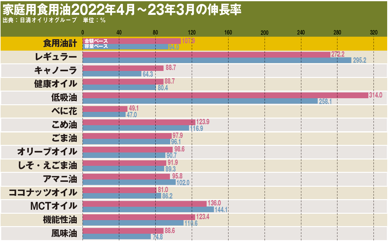 また、こめ油もここ数年右肩上がりを続けているカテゴリーで、金額ベースで同23.9%増、容量ベースで同16.9%増。こめ油はクセがなく、風味がよいため、加工食品や揚げ菓子など業務用で広く使われてきたオイルで、一般的にも健康感や使いやすさなどが浸透し、市場を拡大している。食用油の値上げにより、生活者の購買行動が変化しており、クッキングオイルは価格だけではなく価値で選ぶ時代になっているといえそうだ。