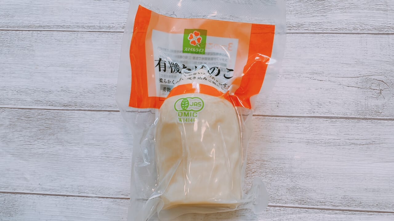 柔らかくえぐみも少ないスマイルライフの「有機たけのこ150g」。HPでは150gと記載されていたのですが、筆者が購入した時は、180gで258円でした。