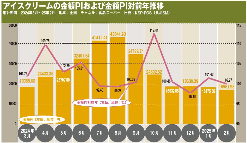 KSP-POSデータによると、アイスクリームの期間通算(2024年3月~25年2月)の金額PIは2万6631円で対前年同期比2.3%増、数量PIは165.46で同0.7%減。24年も昨年同様に全国的に気温が高くなったことからアイスクリームの需要は高まり、7月、8月ともに金額PIは4万円を超えた。