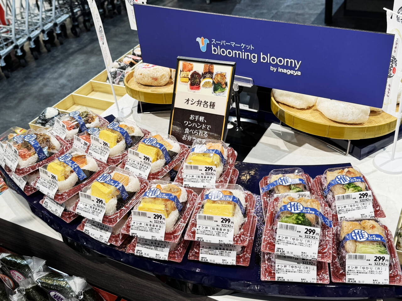 いなげや(東京都)は、「偉大なおむすび」をシリーズ化していますが、200円台を中心とした商品群の上に、「めっちゃ偉大なおむすび」と名付けた税抜389円のラインがあります。加えて、ワンハンドで食べられる弁当として「オシ弁(推しのおかず弁当)」シリーズ(税抜299円)があります。具材を乗せた米飯の下に海苔が敷かれており、だからワンハンドで食べられるというのであれば、これもおにぎりと弁当の境界商品と言えます。