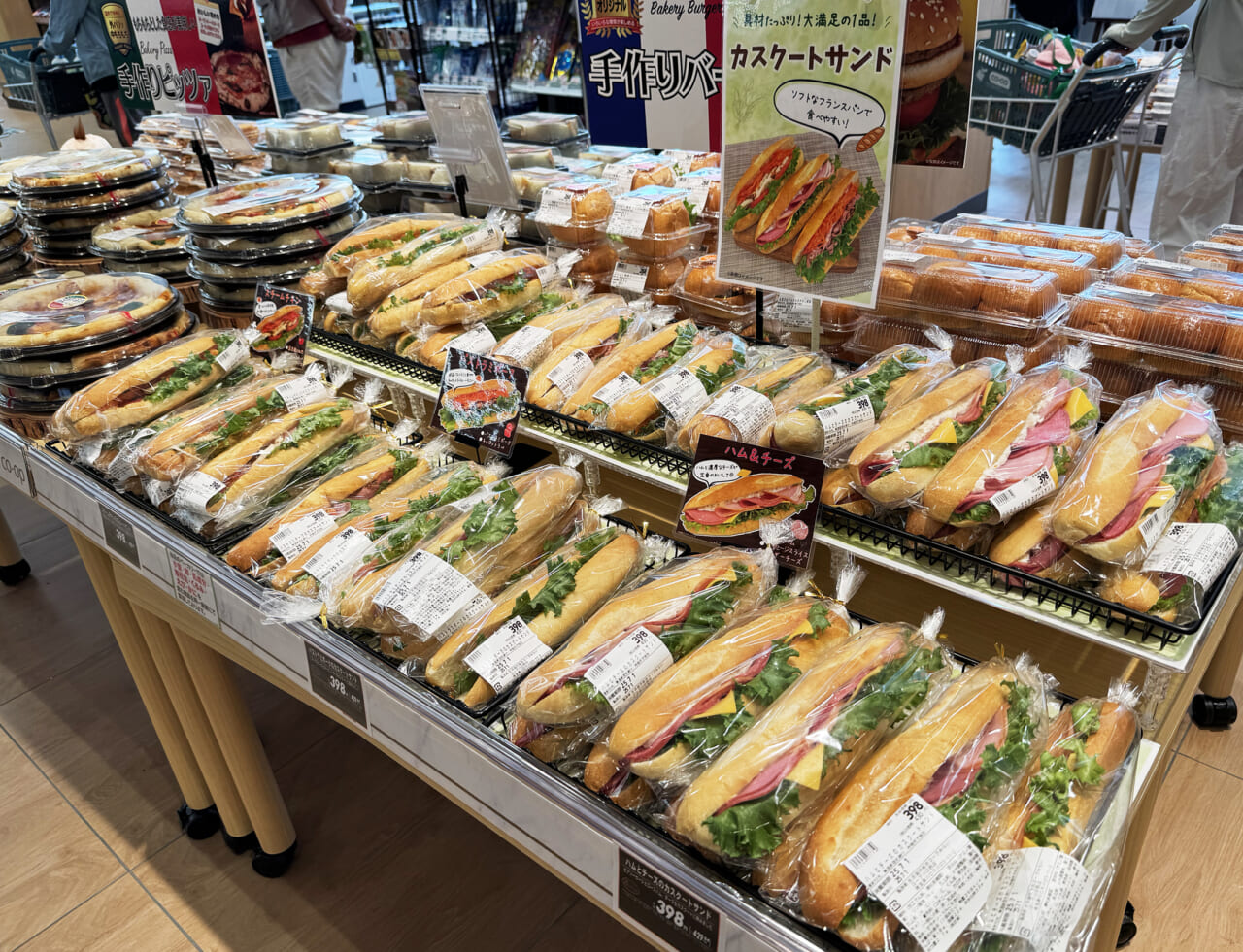 コープみらい(埼玉県)は、今期の新店で「カスクートサンド」のシリーズ化を始めました。常温で販売するバゲット系サンドで、ハム&チーズ、パストラミポークなどを税抜398円で展開します。常温でも葉物野菜やニンジンなど彩りのよい野菜を挟み、フレッシュ感のある見栄えに仕上げているのがポイントです。