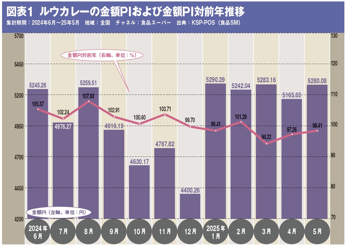 KSP-POSデータによると、ルウカレーの期間通算(2024年6月~25年5月)の金額PIは5033円で対前年同期比0.8%増【図表1】、数量PIは21.33で同0.8%減。価格改定の影響により平均単価が上昇し、金額PIでは微増となった。