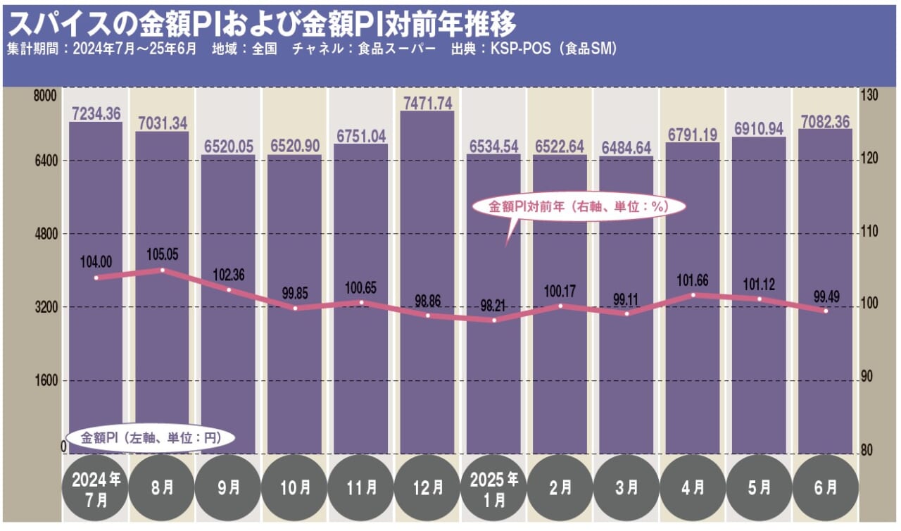 一方、スパイスやハーブ、塩などをブレンドしたシーズニングの期間通算の金額PIは468円で対前年同期比5.6%増。時短・簡便調理へのニーズの高まりや多様な食文化への関心の広がりを背景に、メニュー専用シーズニングは堅調に推移している。