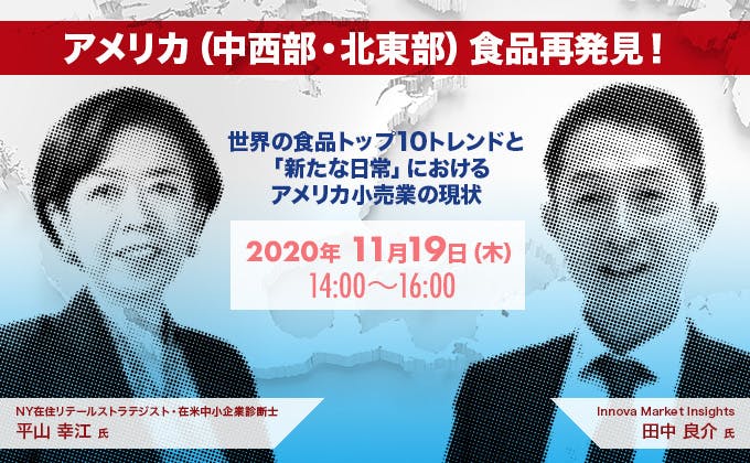 この機会に、アメリカをはじめ、海外のさまざま先進事例に触れていただき、変化し続ける消費者のニーズに対応する商品の開拓や商品開発など、みなさまのビジネス拡大のきっかけにご活用いただけますよう、セミナー参加をご検討のほどよろしくお願いします。