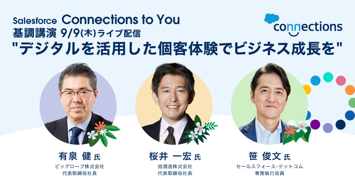 個客行動が大きく変化する中、企業が永続的に成長するためには、リアルとデジタルを融合させ、個客を理解し、繋がり続けることが重要です。デジタルチャネルの拡大で広がる個客とのタッチポイントから得られるデータの活用によって、シームレスな個客体験価値を提供するセールスフォース・ドットコムのDigital 360を活用してイノベーションを実現しているビッグローブや旭酒造の個客体験をご紹介いたします。