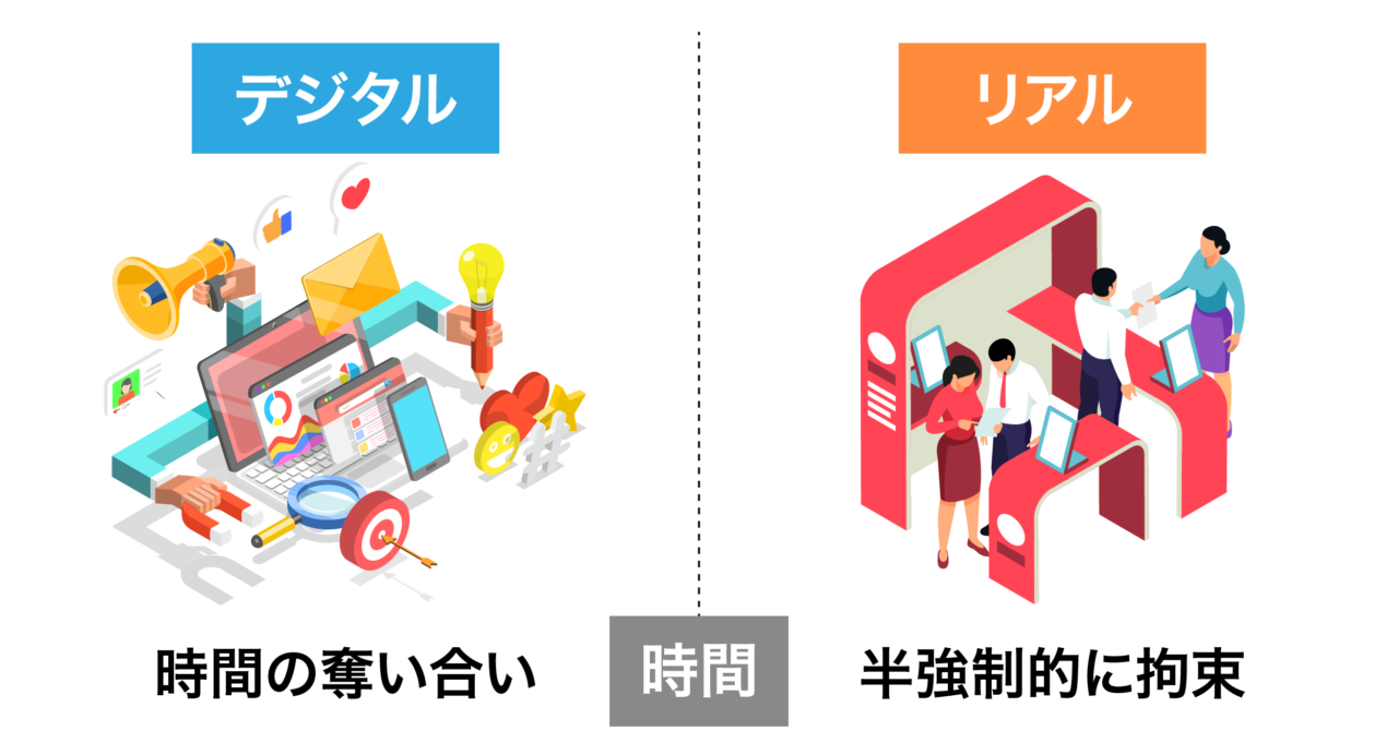 オンラインだけでは顧客のエンゲージや単価の向上が難しく、「目的買い」した商品以外のものを購入してもらうことが非常に困難だということに多くの方が気付き始めています。とくにオンラインでの時間の取り合いは非常に激しく、たとえ5分や1分であっても時間を奪うのは非常に厳しい状態なのです。