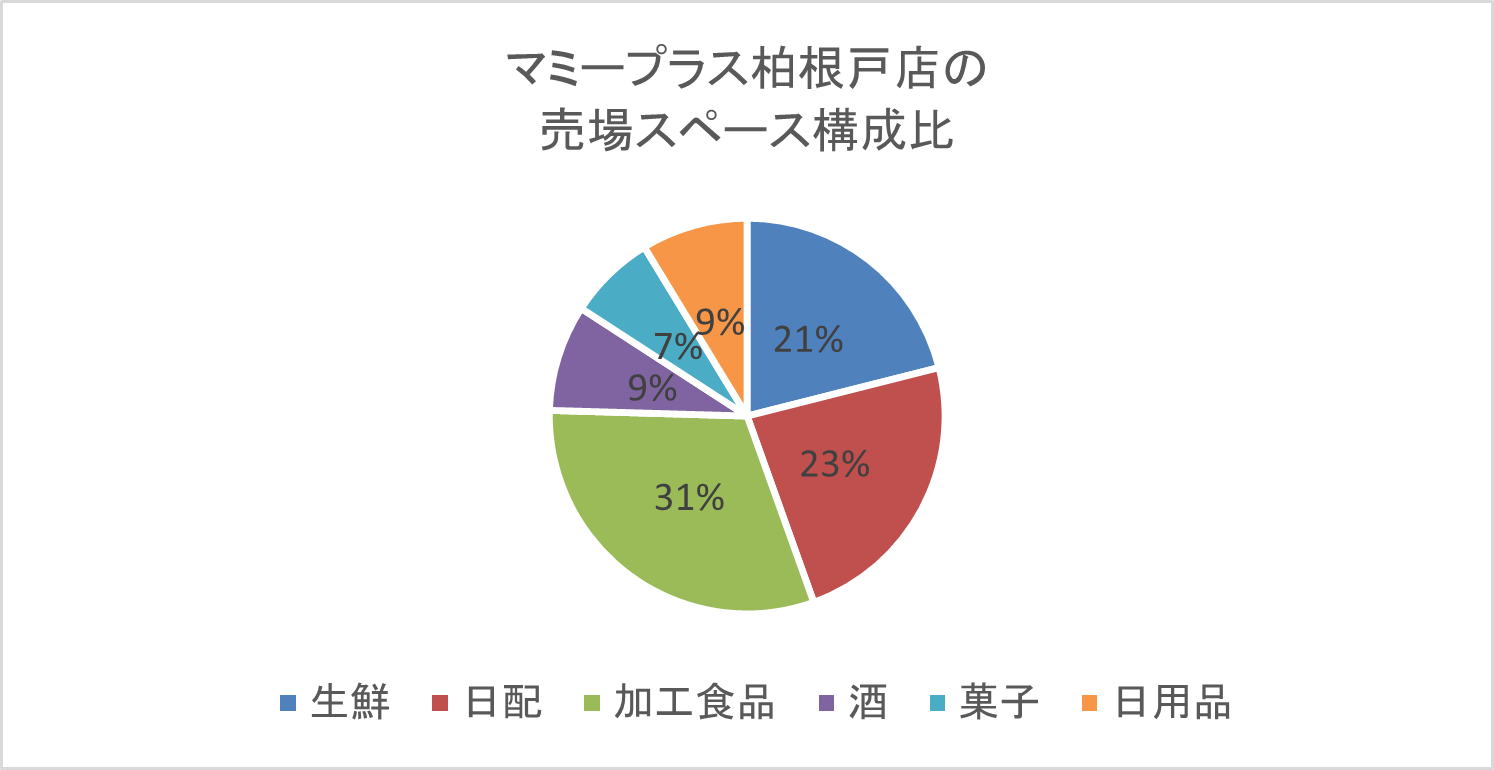 「マミープラス」フォーマットのコンセプトは「安心・健康をプラス」「美味しさをプラス」「満足をプラス」だ。根戸店の売場面積は約520坪(歩測)と、改装前から若干拡大しているようだ。売場スペース構成比は生鮮が21%、日配が23%、合計44%と一般的な食品スーパーと変わらない。非生鮮合計は56%で、加工食品の割合が31%と高い。生鮮4部門の売場スペース構成比は、青果が39%、精肉が21%、鮮魚が14%、総菜が26%で、青果と総菜が軸となっているようだ。