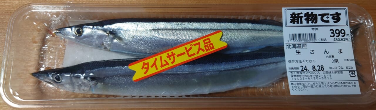 鮮魚売場は壁面と売場中央の平台で挟み込むように季節商品の価格訴求を行い、インパクトを打ち出している。壁面では、入荷が始まった北海道産のサンマを2尾同399円、3尾同599円と手頃な値段で展開している。平台では、カツオのサクを小サイズ同150円、中サイズ同299円と、こちらも目玉商品と言える価格設定で展開していた。