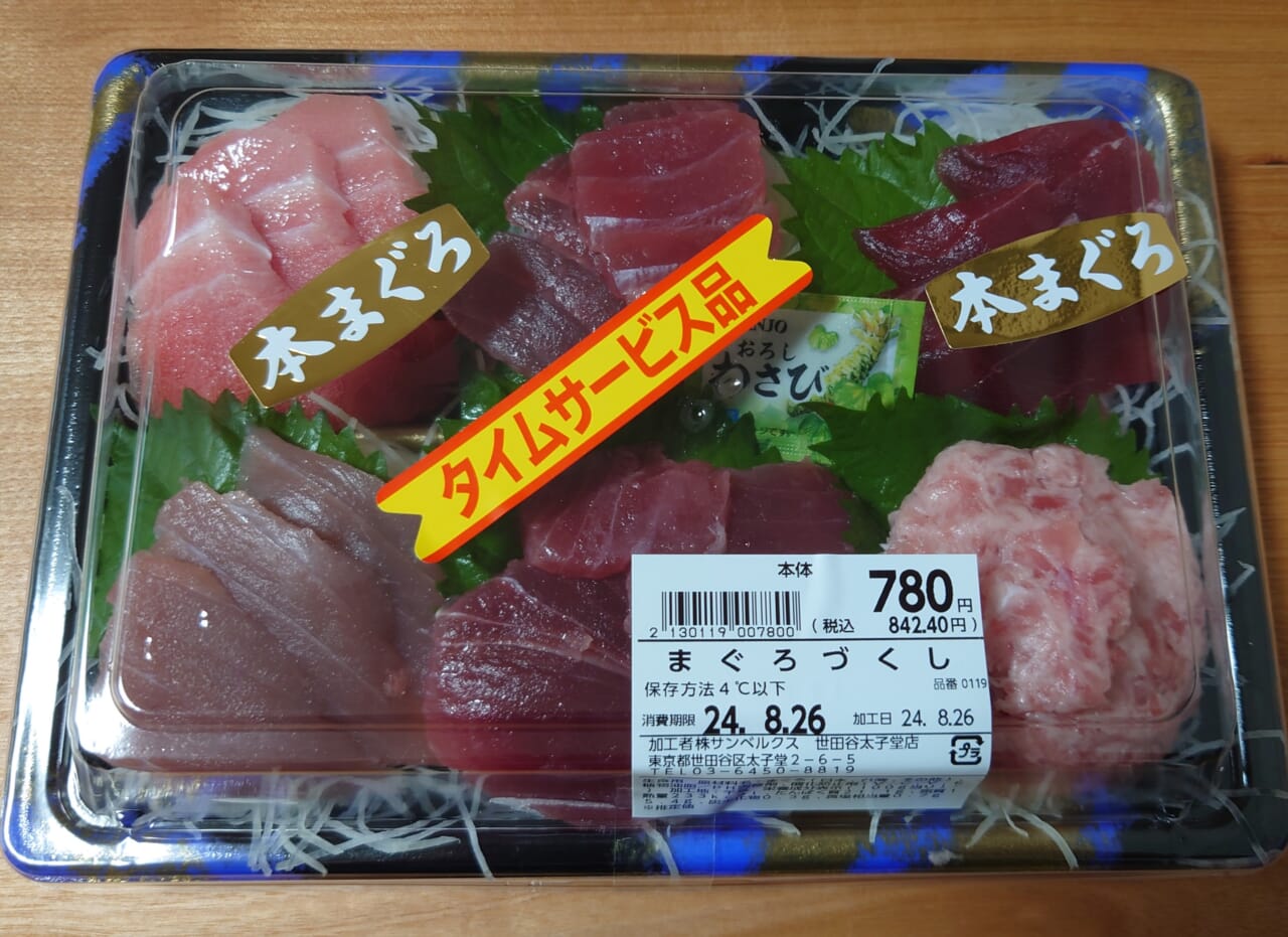 店奥の角にある壁面は刺し身コーナーとし、刺し身の6点盛りを同780円で提供していた。盛り合わせは通常のものとマグロづくしの2種類あり、マグロでは本マグロのトロが含まれている。さらに、4点盛りは同500円、刺し身の小分けサイズは約20SKUを用意し、200円以下の商品から同399円の商品を中心に構成することで、コストパフォーマンスを訴求するコーナーとなっている。